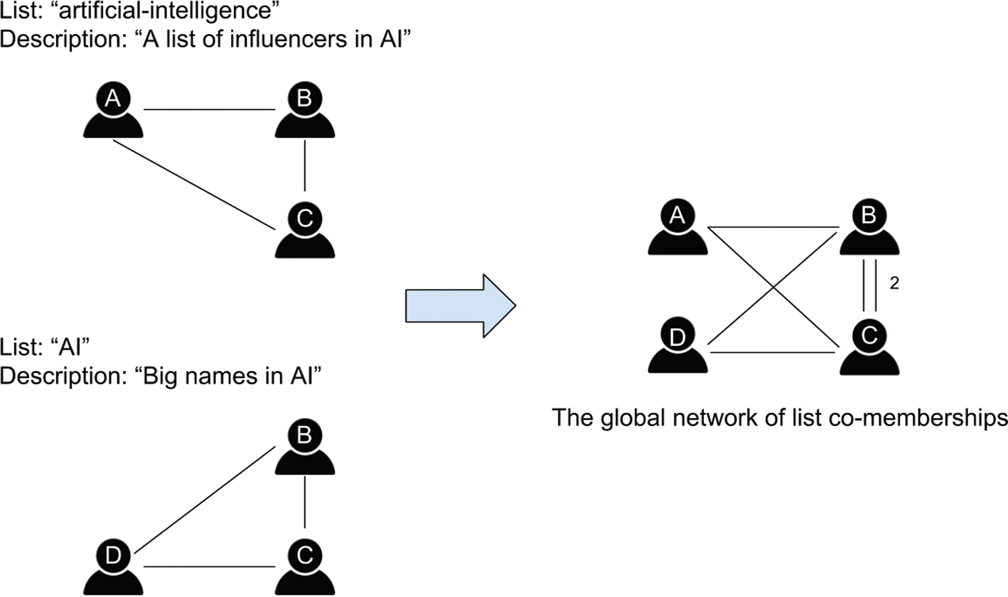 Figure 1. Using lists to discover Twitter users related to seed accounts. We consider the lists of which the seed user (here, ‘B’) is a member. Here, B is a member of lists ‘artificial-intelligence’ and ‘AI’. We collect all members of these two lists (A, B, and C for the list ‘artificial-intelligence’ and B, C, and D for the list ‘AI’). We consider that a connection exists between any two Twitter accounts if they belong to the same list. If they belong to several lists in common, then the weight (‘strength’) of their connection increases (if two Twitter accounts belong to two lists in common, the weight of their connection is equal to 2, etc.). Here, B and C belong to two lists in common, so the weight w of their connection is equal to 2. If we set k = 2 (see the main text), then only actors B and C and the link between them will be included in the field