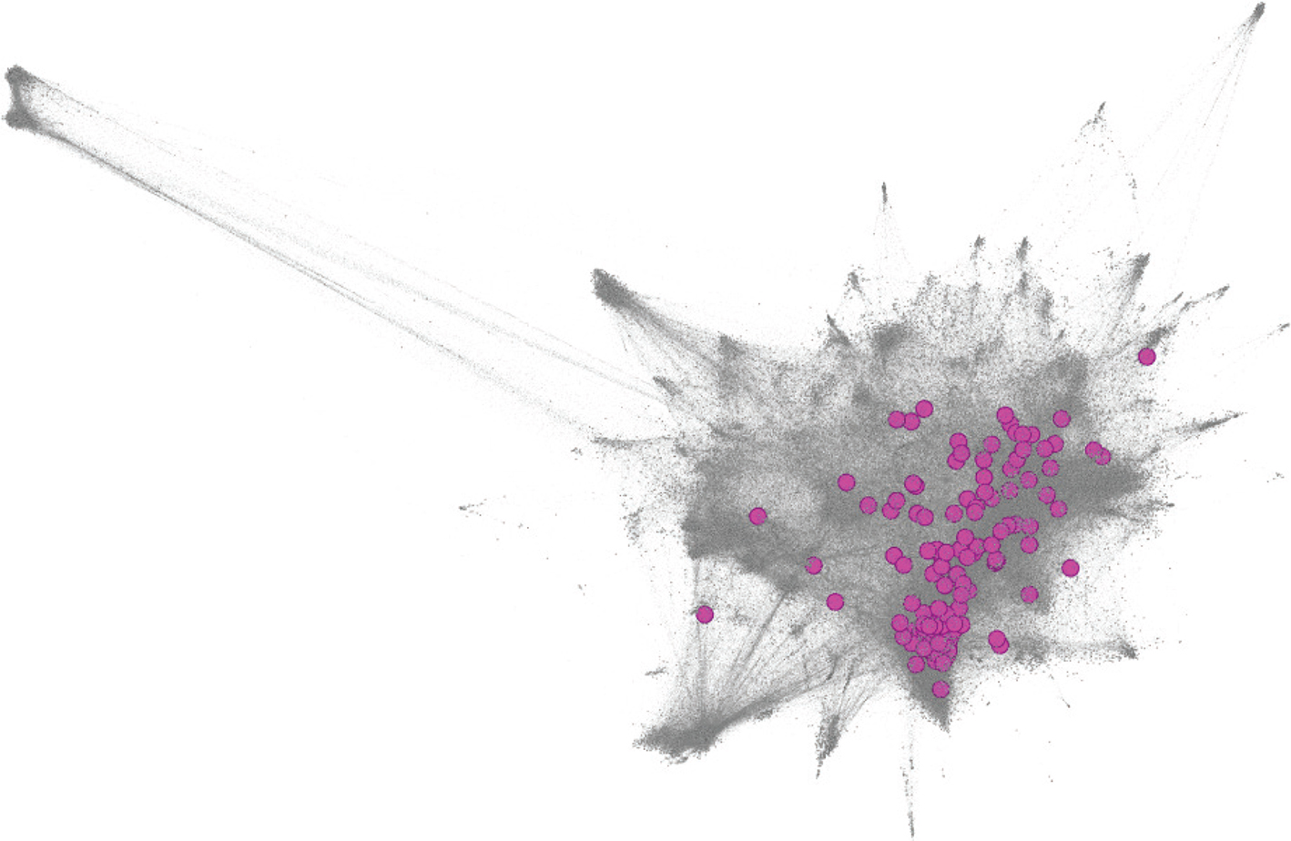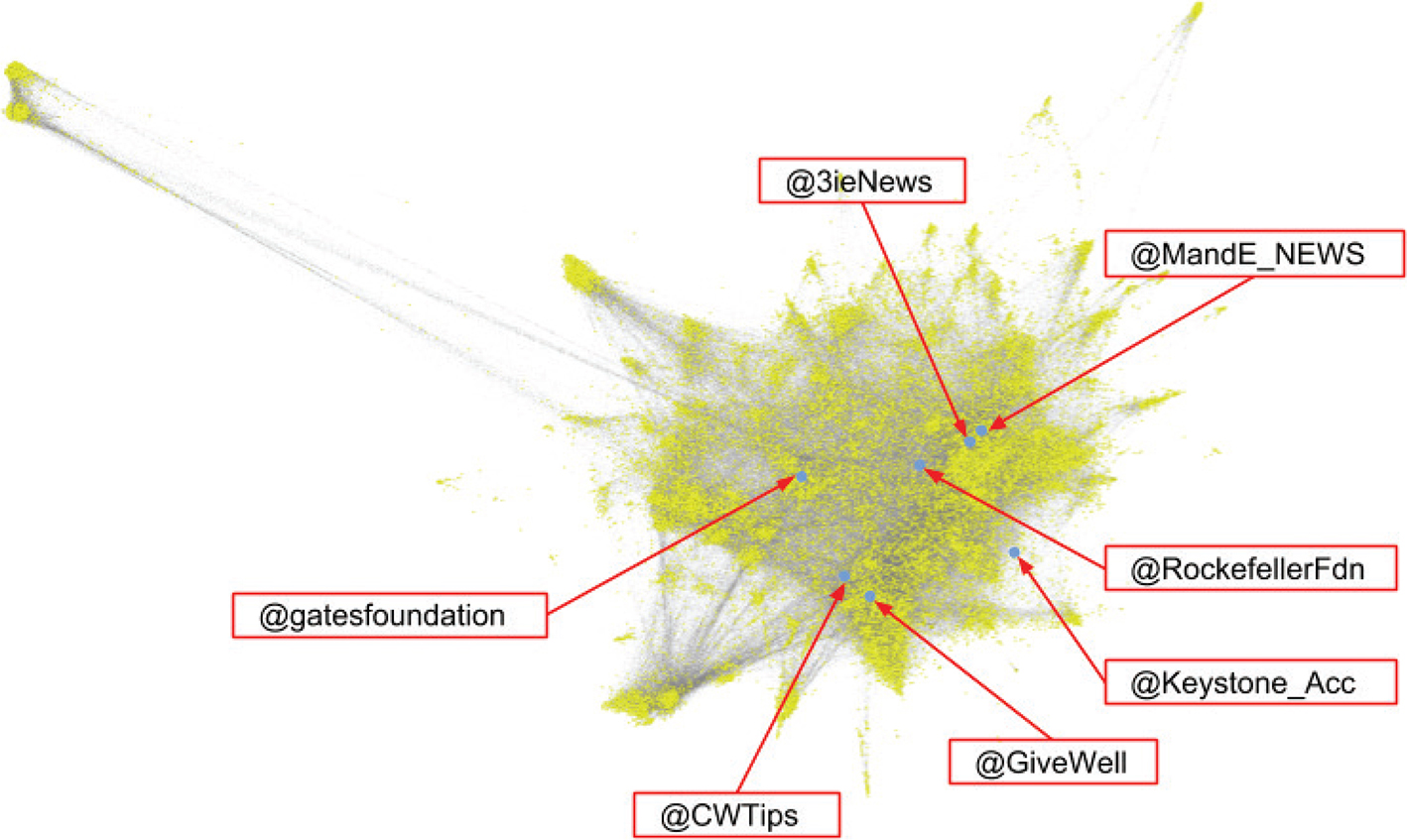 Figure 3. The 30,575 actors identified by our procedure (connected by 1,098,110 relations). These actors were identified by using seven seed accounts mentioned in Powell et al.’s (2017) study which relate to the issue field of ‘social impact’