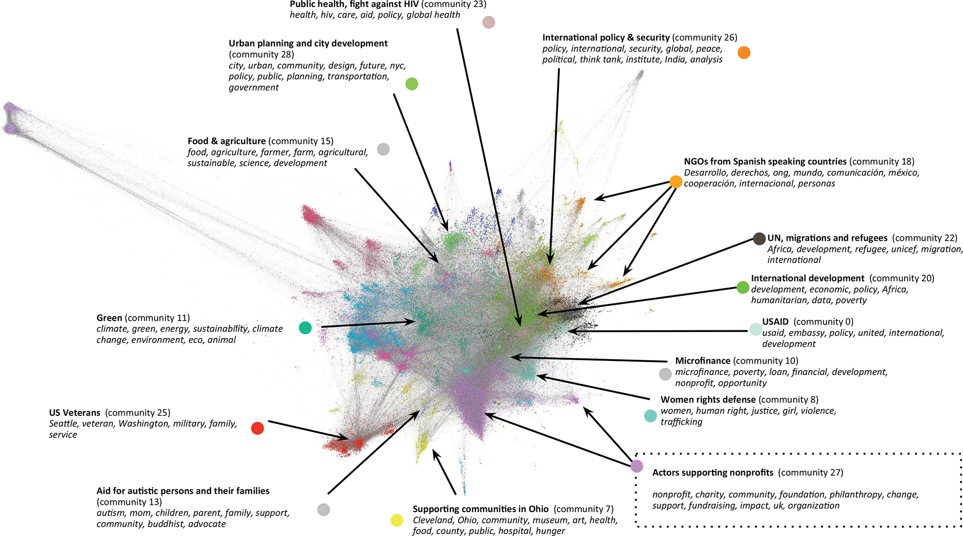 Running the Louvain algorithm on the network produces 30 sub-regions. For each sub-region, we perform a content analysis to arrive at a list of the 10 most frequent terms used in the Twitter biographies of the actors in the sub-region in order to identify the key topics characterizing each sub-region (see Appendix I for a link to the code). We draw the map with sub-regions shown in different colors, with the most relevant sub-regions and the result of their content analysis shown in Figure 5 (see Appendix C for an oversized version). A complete list of sub-regions and their 10 most frequent terms can be found in Appendix D.