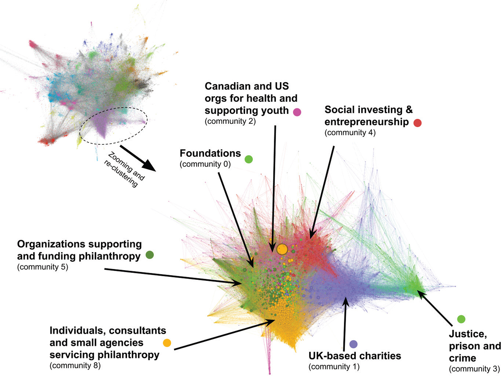 This iteration gives a finer view on sub-region ‘27’ and the sub-groups it is made of. In particular, it is now visible that this sub-region comprises distinct sub-groups which follow two unrelated logics. Sub-groups ‘1’, ‘2’, ‘3’, and ‘4’ gather actors according to topical or geographical dimensions, while sub-groups ‘0’, ‘5’, and ‘8’ are indeed directly related to helping nonprofits achieve social impact. These sub-groups (which comprise, respectively, 538, 243, and 931 members) give a coarse view of the following three types of actors forming the social space of ‘social impact of nonprofits’: