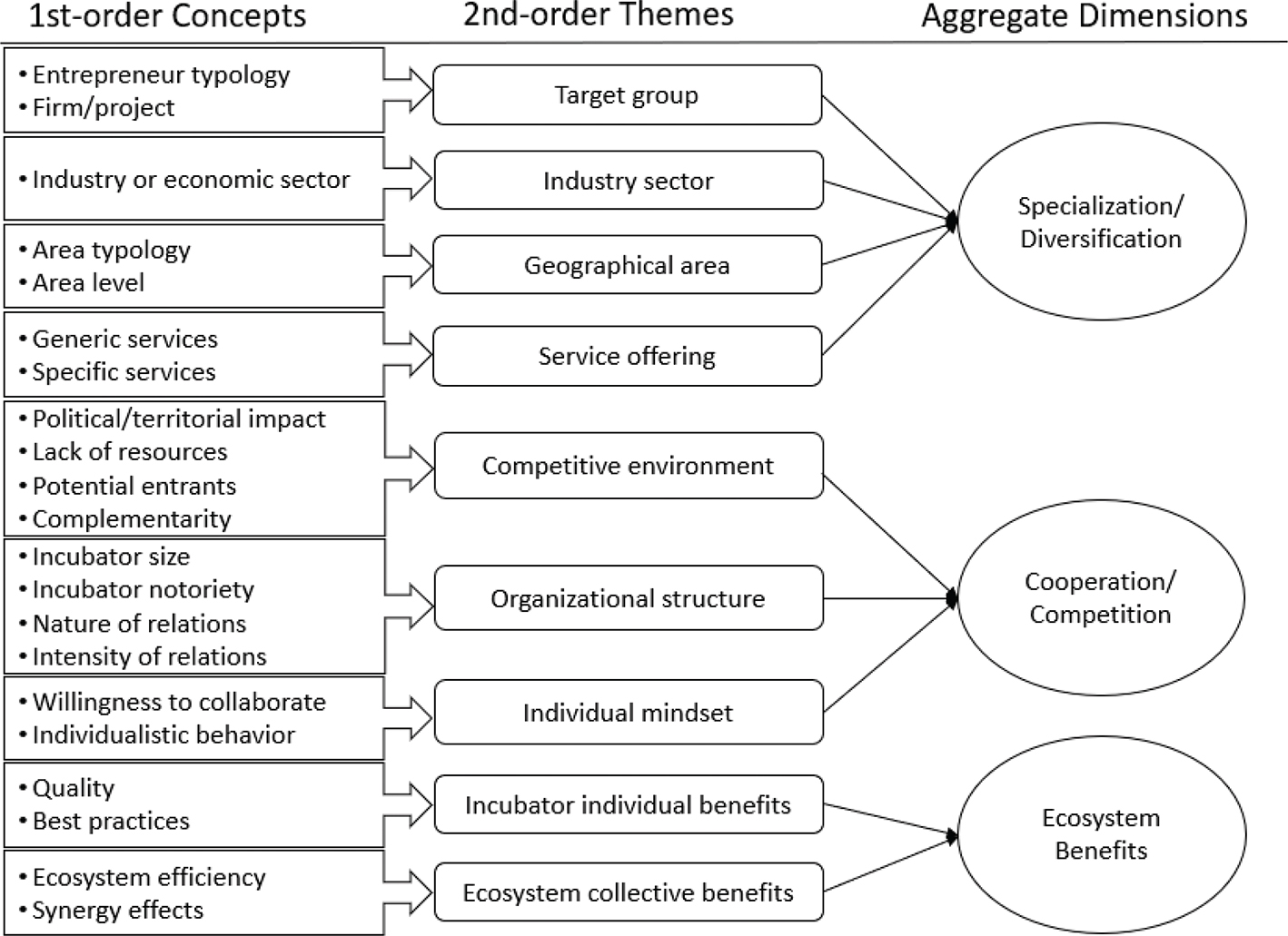 Finally, the entrepreneurial support ecosystem is a dynamic and highly complex environment, in which a large volume of information and knowledge must be mastered (Carayannis & Alexander, 1999). Incubators join networks, create synergies, and participate in resource transfers to support new firms. However, the high level of heterogeneity cannot sustain synergy without complementarity (Huang & Chu, 2015; Thomas & Autio, 2014), and this complementarity is based not only on the functional characteristics of each actor but also on their obligations to other ecosystem actors. In addition, inter-actor complementarity and interdependence are driven by competitive and cooperative dynamics (Bengtsson et al., 2010; Bonel, Pellizzari, & Rocco, 2008; Bonel & Rocco, 2007). Thus, complementarity is related to a cumulative dimension of the value added by each actor (Jacobides et al., 2018; Thomas & Autio, 2014) and is enhanced by reducing duplication in the core capabilities of the ecosystem actors. Accordingly, this framework leads to the following fundamental question: How do incubators ideally elaborate internal (specialization and diversification) and external (cooperation and competition) strategic fit as an engine of differentiation within the entrepreneurial support ecosystem?