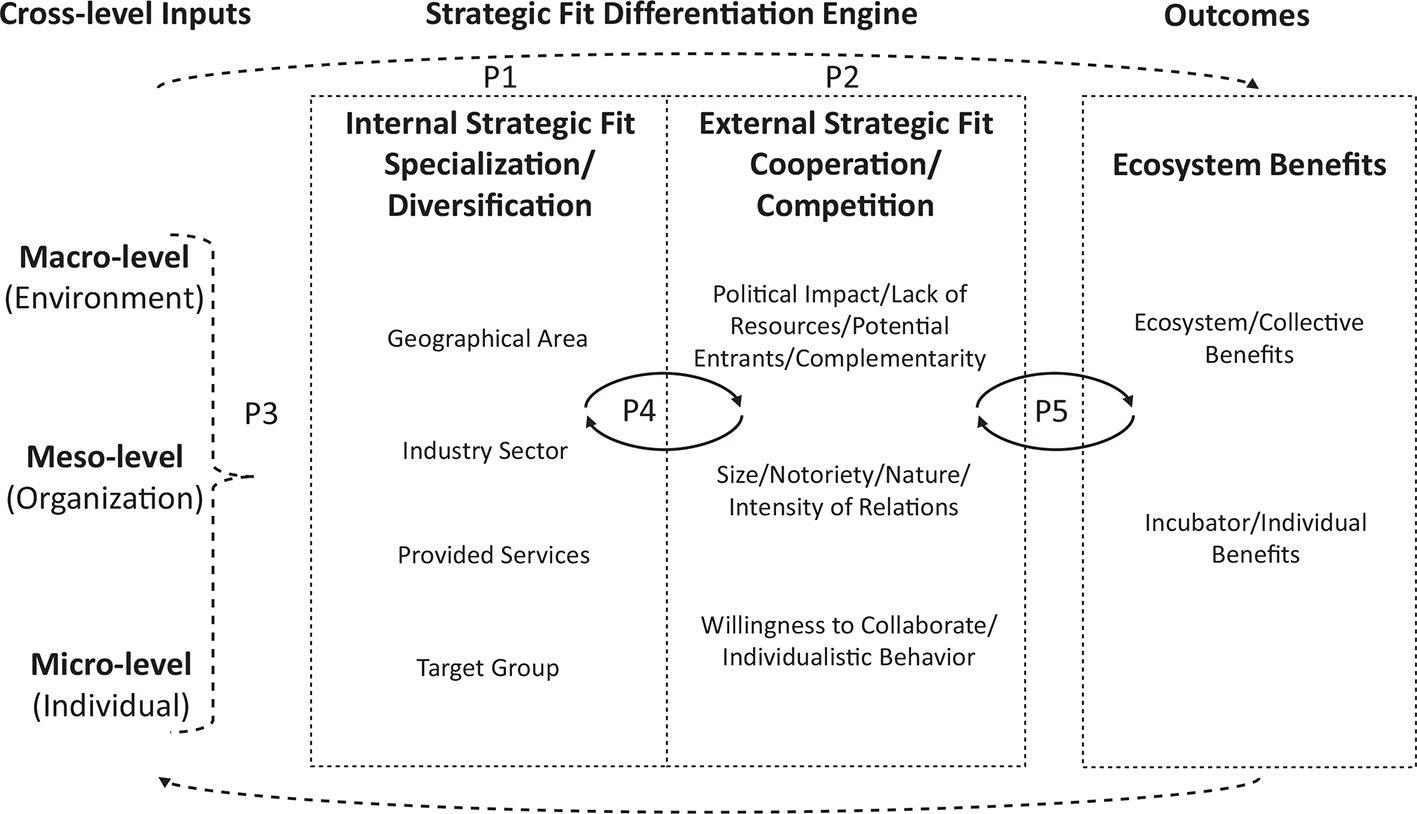 Proposition 5: An ideal strategic fit differentiation engine driven by environmental, organizational, and individual specificities contributes to enhance both incubator and ecosystem benefits within the entrepreneurial support ecosystem, which, in turn, contribute to evolve the strategic fit differentiation engine.