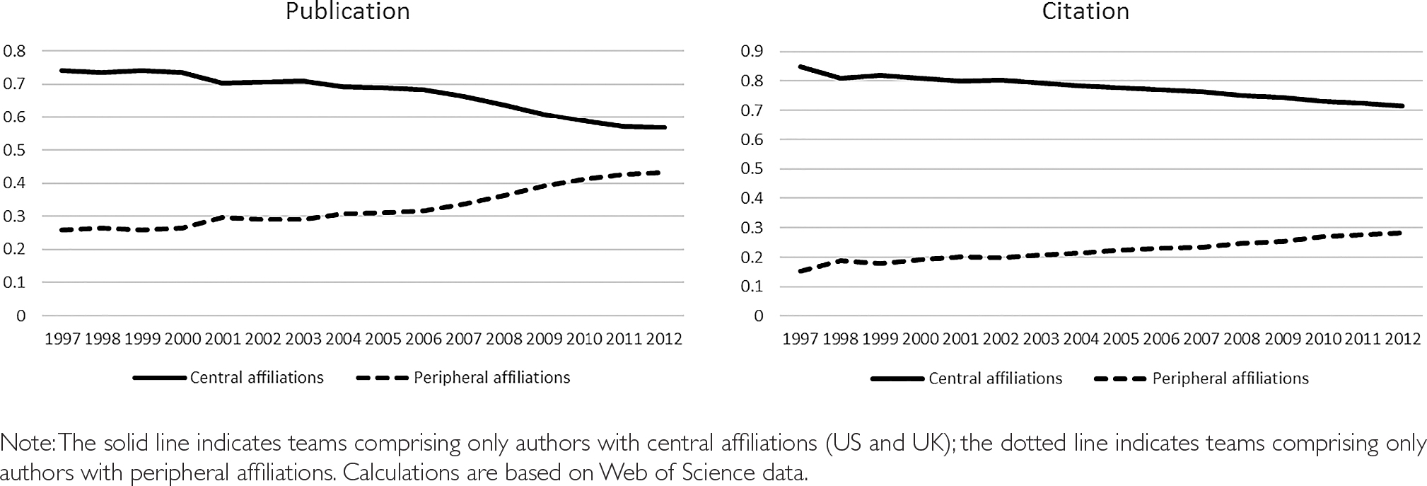 This study addresses two contentious and prominent research questions: (1) Do affiliation origins of scholars in a research team influence the academic impact (i.e. citations) of its research outputs? and (2) How can research teams mitigate and overcome the potential effects of the liability of affiliation origins? Using a large database containing information on more than 65,000 business and management research articles published between 1997 and 2012 and whose teams of authors originate from all over the world, we examine the effect of ‘peripheral’ affiliation on the citations of the knowledge published by a research team and test the moderating effects of targeting and framing legitimation strategies on that relationship. We operationalize ‘peripheral affiliation’ as the proportion of authors in a research team not affiliated with a US or UK institution (Üsdiken, 2014). Our analysis focuses on team-produced knowledge, as team science has been a pervasive norm in the contemporary knowledge production landscape (Wuchty et al., 2007). Given today’s lower collaboration costs and tendency toward more division of scientific tasks (Katz & Martin, 1997; Lee et al., 2015), team science or team-based knowledge production is the current norm in many academic disciplines (Wuchty et al., 2007) as well as in business and management research communities (Liu et al., 2017).