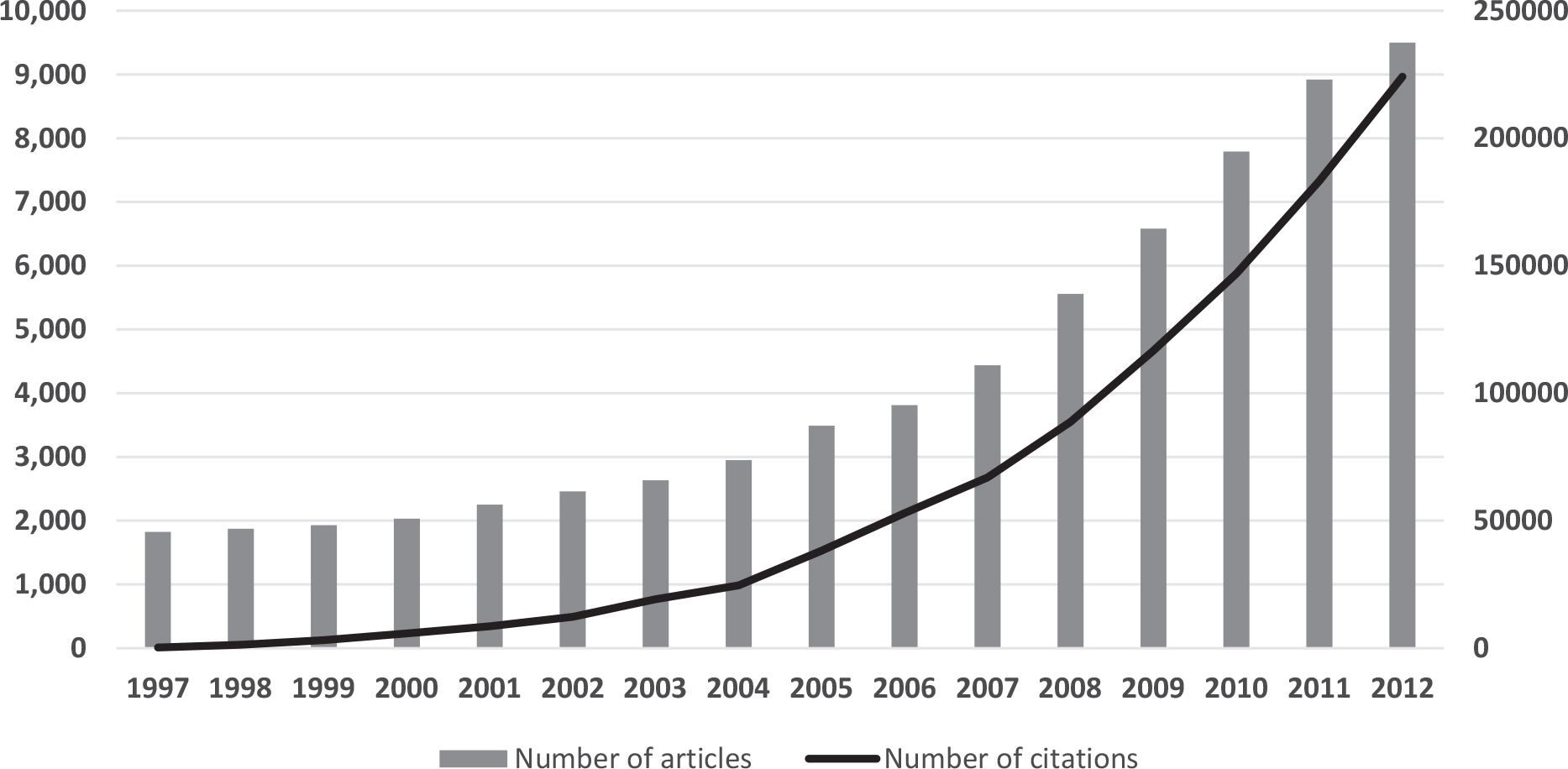 In Figure 2, we can observe the exponentially increasing trend of the distribution of articles included in our final dataset and of the received citations over the period of analysis.