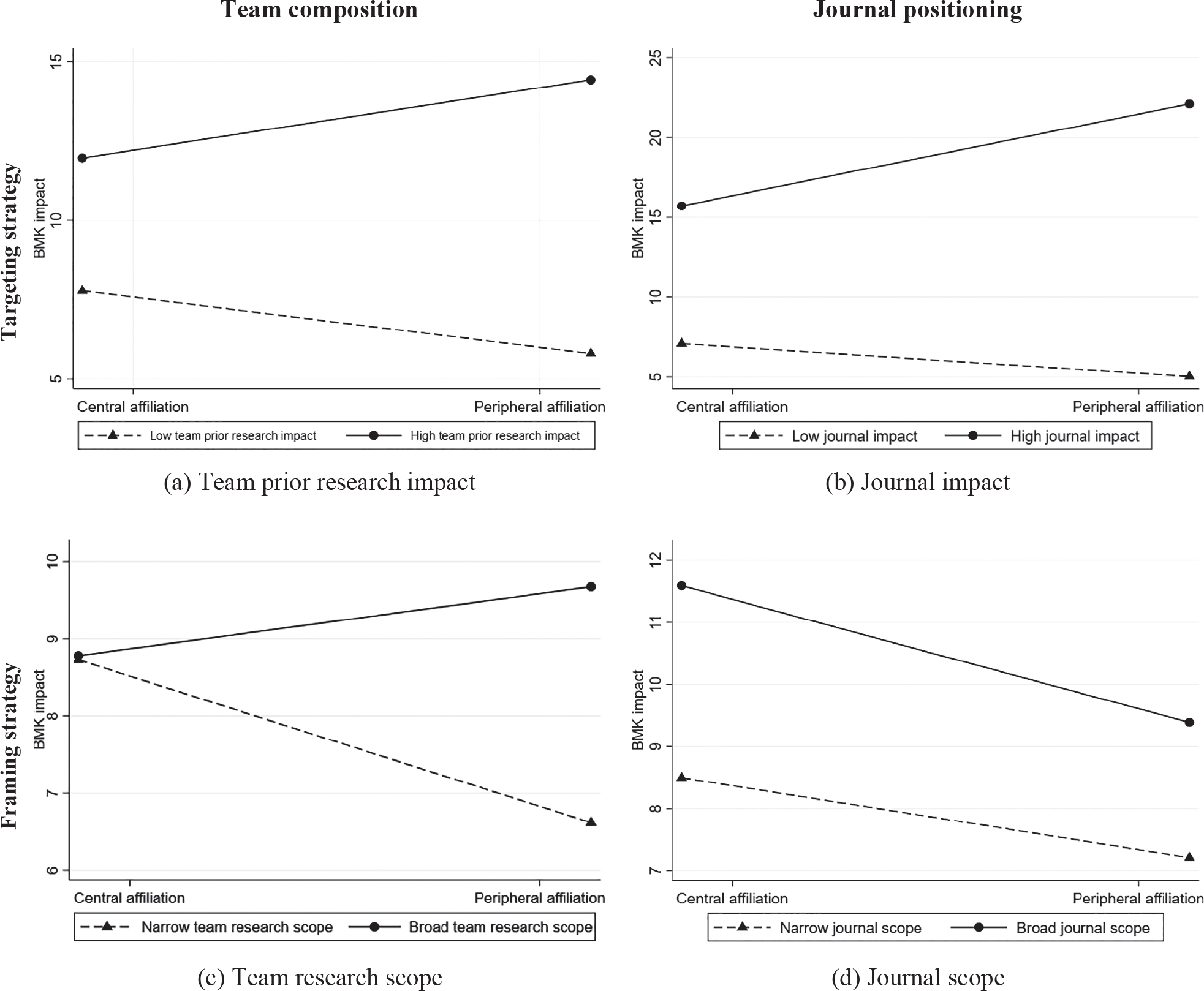 In summary, the ‘penalty’ in received citations due to ‘peripheral’ affiliations may be offset when the work is co-authored by scholars originating from several disciplines and is published in generalist journals because the research output will be exposed to various audiences and be diffused more broadly through diverse communication channels. Thus, we hypothesize the moderating effects of framing legitimation strategies in team composition and spatial positioning on the relationship between the peripheral affiliation and the academic impact of BMK: