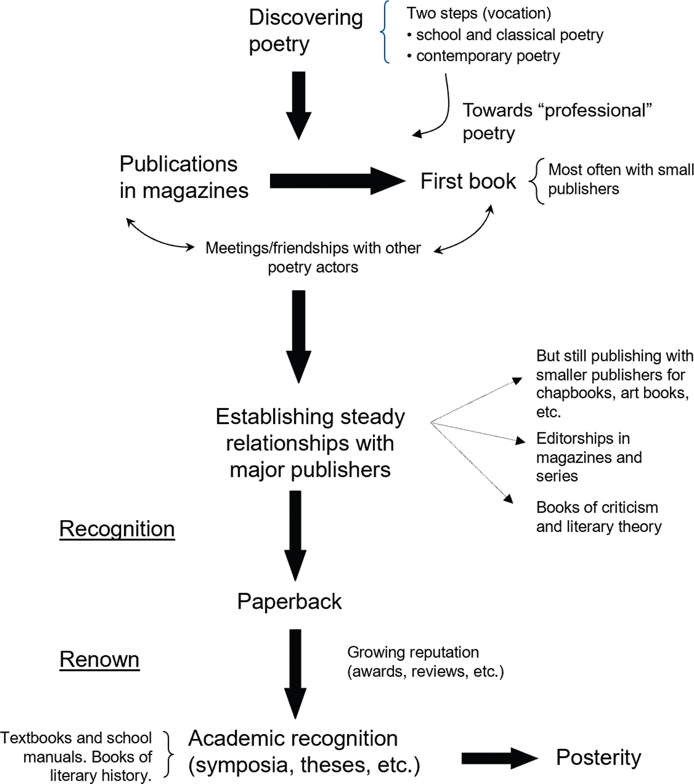 Academic consecration is especially important as the education system passes on the literary heritage to new generations and shapes the pantheon, particularly in France, where literature has played a key role in the making of the French State, the republican ideology, and its embodiment (Vaillant, 2017). The involvement of poets in the education system is thus important. Many prominent poets (Deguy, Bonnefoy, Roubaud, and Maulpoix) lead a two-sided ‘academia/poetry’ career, which is important, in that they can disseminate knowledge about poetry and encourage academic work on contemporary poetry (i.e., PhDs and symposia). However, very few creative writing programs exist in France.6 French poets working in universities do not teach literary creation, but literary history, unlike in the United States (Spiro, 2004).