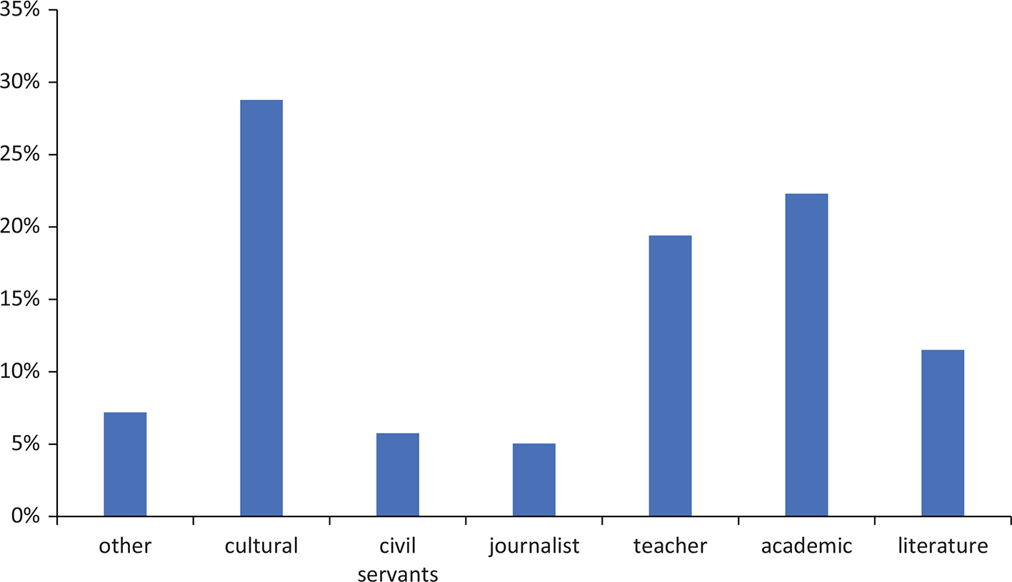 To assess more systematically how poetry careers are structured, we use quantitative data. We first did a survey of the sales of 42 prominent contemporary poetry books published over the last 20 years and whose figures were available on the professional database Edistat.3 These estimates of sales, widely used by professionals, enable us to draw conclusions. To determine poets’ publishing patterns, we used a database of 150 French poets born between 1899 and 1970, and who have been active since 1945. We built this initial list by recording all poets in the biographical database of the two main poetry institutions (Printemps des Poètes and centre international de poésie, Marseille), to which we added those mentioned in 13 anthologies of contemporary poetry (see Appendix 1 for the list of these anthologies). After drawing up our initial list, we measured poets’ reputations by building an index using a set of weighted criteria (number of books released by large, medium, and small publishers, literary awards, and number of PhD theses devoted to the author), presence in the two main contemporary monographic poetry collections, and committee membership of poetry institutions (see Appendix 1 for the detailed weighting of this index). We retained the 150 poets with the best reputation scores and collected bio-bibliographical information on them. As poetry careers are very long, some poets are old, having been born at the beginning of the 20th century but still active in the 1990s and 2000s. Note that for only 11% are literature their primary occupation. This is also true for novelists, playwrights, and poets able to make a living through workshops, readings, or grants. The vast majority have a second job, mainly in education or in the cultural sectors (editors, librarians, curators, etc.), as summarized in Figure 1.
