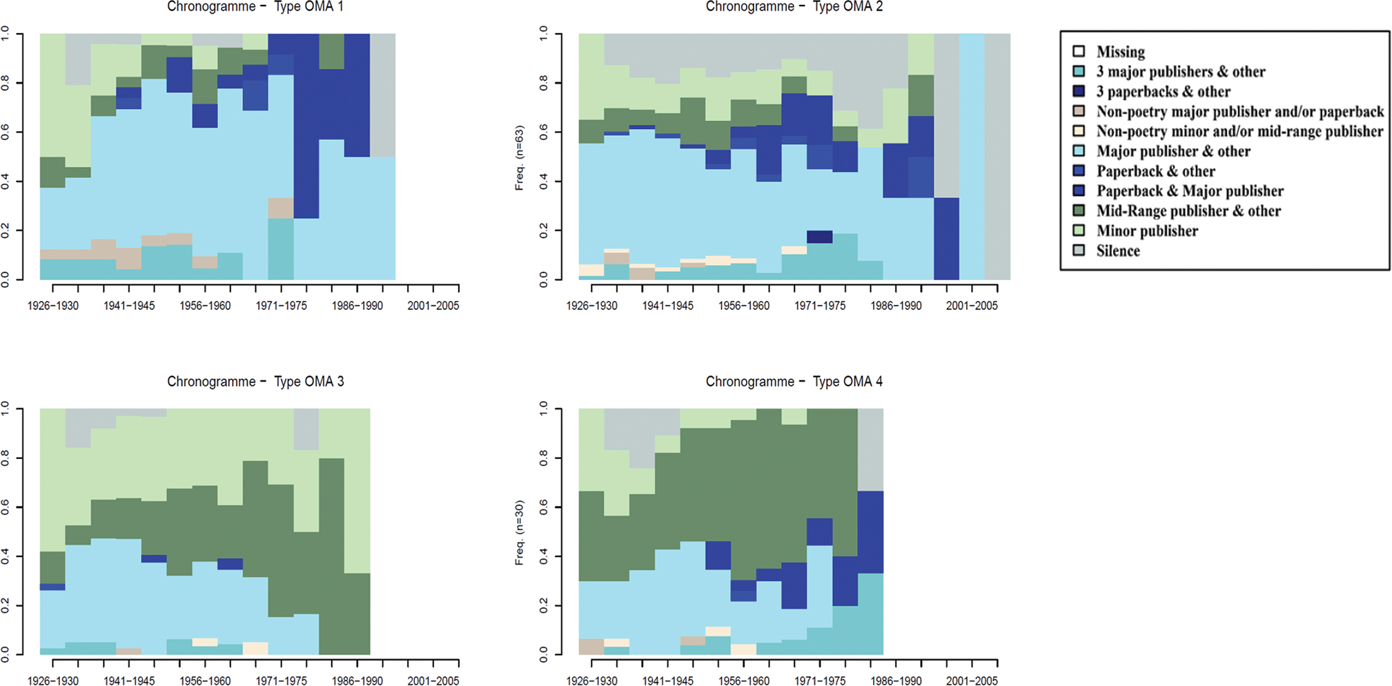 The chronograms demonstrate that Types 1 and 2 poets spend much more time with major publishers and paperback publications than Types 3 and 4. Type 1 stands out from the others due to the length of time spent in the ‘major publisher’ state. The length of time spent in the paperback state also differentiates Type 1 from the others (see Table 4).