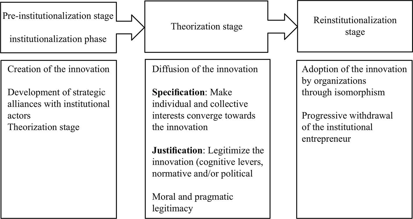 According to Greenwood, Suddaby, and Hinings (2002), the institutionalization process should be carried out in several stages. The starting point of the process is the social event, which focuses on regulation or technology that comes to question the dominant institution. Actors who have the ability to analyze their organizational field offer innovative solutions drawn from other institutions in closely related organizational fields (Levy & Scully, 2007). In this ‘pre-institutionalization’ stage, actors seek to surround themselves with professional actors and experts with whom they can develop alliances (Battilana et al., 2009) and to mobilize material and immaterial resources (Hardy & Maguire, 2008).