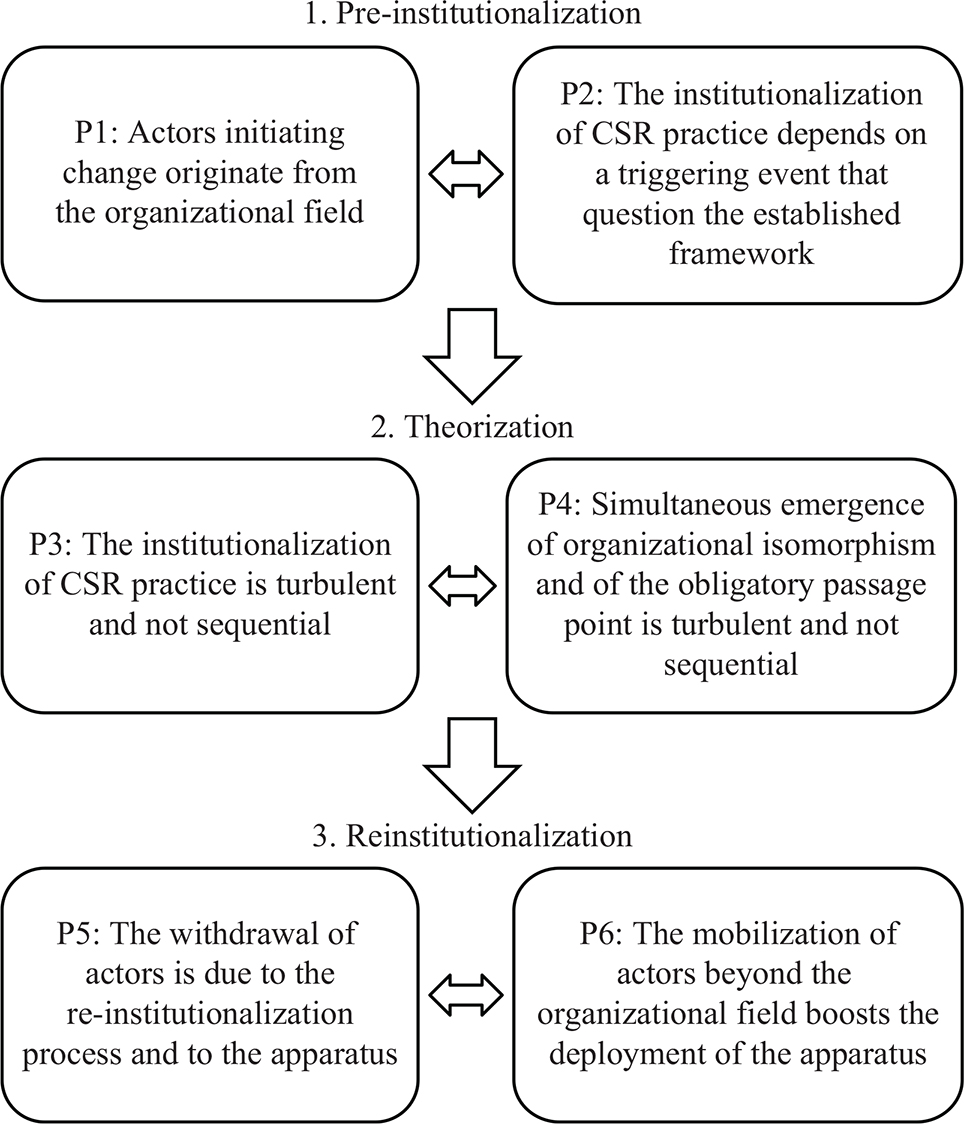 According to NIT and ANT, the institutionalization process and diffusion of the innovation have the same starting point, i.e., a jolt, an event that questions the established framework through an externally imposed change or through internal diagnosis (Proposition 2). The two theoretical frameworks overlap when considering the starting point of the pre-institutionalization process. For NIT, an event (jolt) first disrupts the equilibrium of the institutional framework; the event may be social, regulatory, or technological (Greenwood et al., 2002). Following this event, actors of institutional work offer solutions to restore the balance of the institutional framework. If we apply this NIT approach to the development of CSR, it means that the organizational field is destabilized by an event and CSR comes along as a solution to reconfigure the institutional framework through the development of an innovative object, such as a label or a certification. In ANT, however, the event that modifies the institutional framework is the emergence of an innovative system created within a developing network. Therefore, ANT consists of enhancing the social dimension of technical innovation and in identifying the different network actors and their respective roles in development of the innovation.