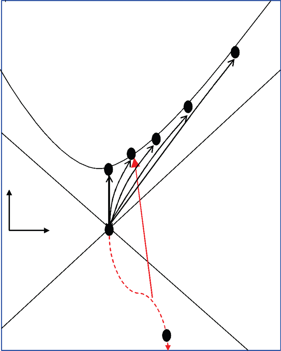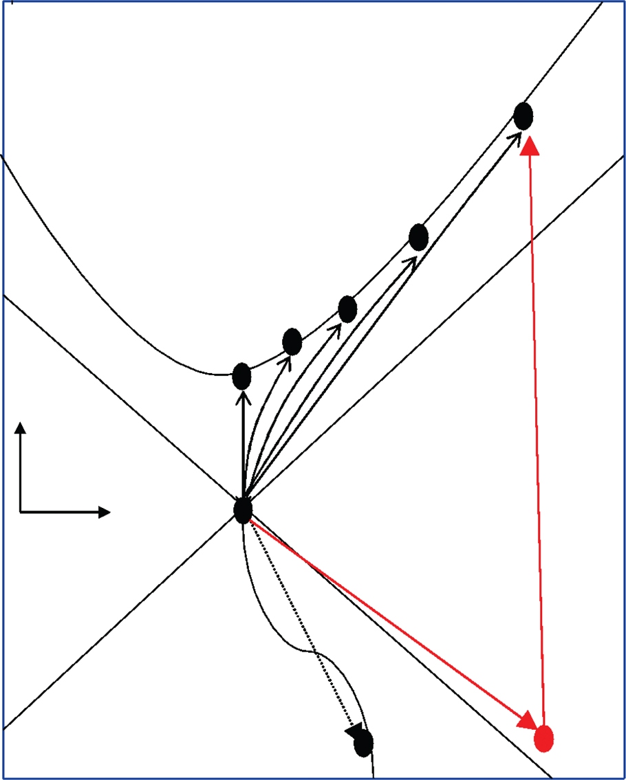 Two assumptions, in terms of ontology and epistemology, define this renewal strategy (Suddaby & Foster, 2017). First, the top management of a firm with declining performance must hold an objective assumption of spacetime. That is, the ontology of the firm’s trajectory from the past to the present is seen as ‘brute facts’ that led to the current situation of decline. In turn, despite the constraining forces of history, this renewal strategy implies that top management can interpret the path differently (the epistemology). For instance, the management team can critically examine crucial turning points that led to the current situation. In the terminology of Minkowski spacetime, a firm might reconsider the trajectory from P’ to P. By collectively reflecting about the past, a firm might find a consensus of what should be done differently in the future. This kind of thinking helps a firm to break from path dependence, since it might accelerate motion to a worldpoint non-P’, distinct from inertial organizational death at worldpoint P’ (Figure 2).