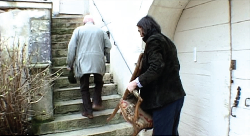 Still 2. Nossiter’s helper Juan carries the Louis XV armchair belonging to Henri de Montille (seen from behind) to the sitting room