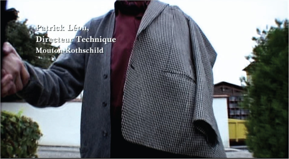 The on-screen result of this ‘featherweight’ filmic device is a ramshackle DIY esthetic, unforgettable for the viewer (Still 1), far removed from the ‘luxury product’ and the technical expertise that characterize both the great marque wines and the blockbuster movies (including documentaries). The single camera wanders, trembles, zooms in and out, suddenly pans, or lets the microphone into the frame.