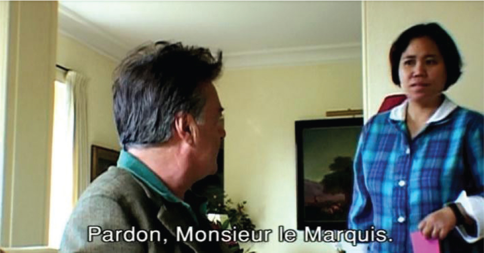 However, it is lively, curious, spontaneous, and subjective, like the filmmaking team themselves, and reflects their way of approaching reality (see above). Each character is thus situated visually and aurally in an environment made up piecemeal of assorted elements (discourse, objects, spaces, landscapes, men, women, animals, external events, etc.), which are brought into the picture by a highly mobile camera, operating sometimes with a fertile decoupling of image and sound. The framing also has an ethical dimension. It tends, in particular, to equalize positions and issues: far from making the owner or manager the hero, the camera readily brings into the picture the family (spouse, child, parent, siblings, photographs of the departed, family archives, etc.), men and women in the sidelines (assistants, press agents, heads of communication, or receptionists), or ‘invisible’ players (‘ordinary’ employees, house staff, or agricultural workers). Generally, Nossiter’s eager camera accepts all those who are ‘there’ at the time of filming, simply because they are ‘there’, living testimony that wine, like the film itself, is a shared adventure. In particular, this allows Nossiter integrate the question of inequalities in position and place into the narrative (Still 5).