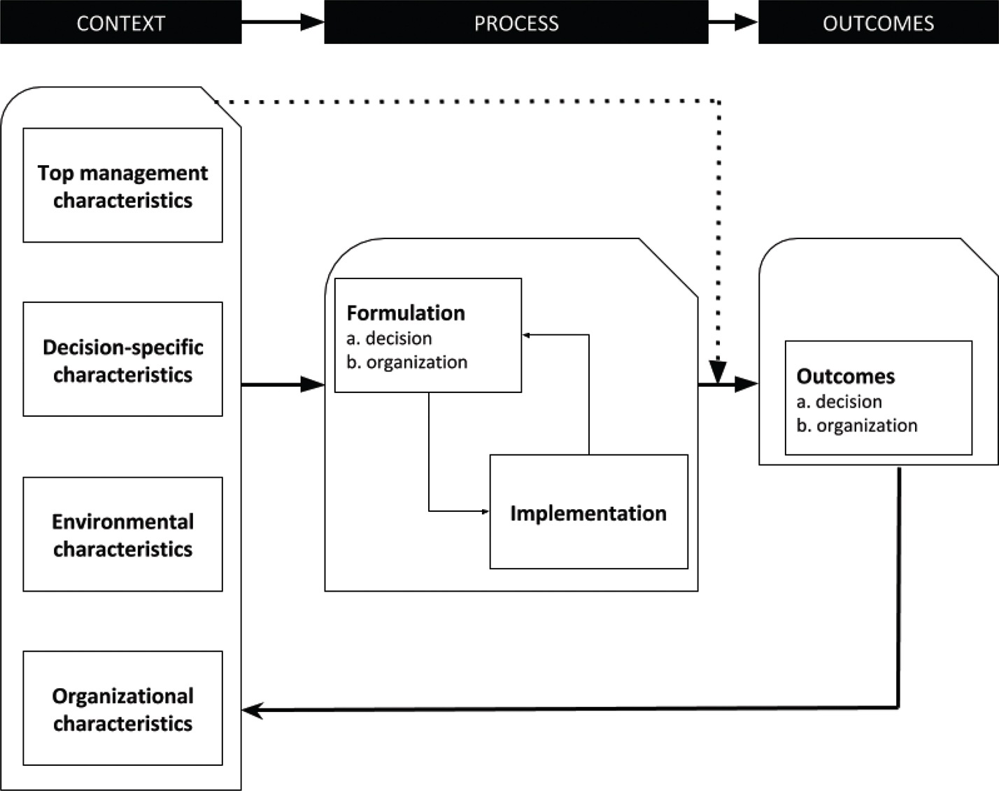 The decision process refers to the process by which a strategic decision is formulated and implemented, that is, the process that leads to the choice of goals and means and the way that means are effectively deployed (Elbanna, 2006; Noorderhaven, 1995). Formulation concerns the way that the decision comes about, whereas implementation is about the way that the decision is put into action (Elbanna, 2006; Rajagopalan, Rasheed, Datta, & Spreitzer, 1997). Decision outcomes are the intended (Papadakis et al., 1998; Shepherd & Rudd, 2014) and unintended (Elbanna, 2018; Elbanna et al., 2013) consequences of the strategic decision process. Decision outcomes are the results of decision formulation and implementation and represent the direct organizational and social consequences of decision activity. Organizational performance is the actual outcome of the functioning of an organization. These definitions of context, process, and outcomes together form the backdrop against which we can place the individual papers of our review.