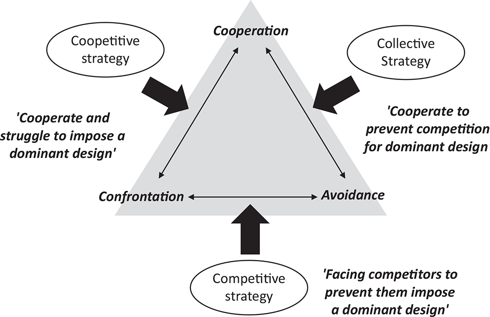 The selection of a dominant design implies that actors lead toward similar options. Imitation and collaboration, for example, are cornerstones in the process of dominant design development. However, the stabilization of a dominant design depends on relationships that firms have (or do not have) with their competitors. Those relationships can involve three different logics: confrontation, cooperation, and avoidance (Kœnig, 2004). These three logics can be used to define three ‘strategic maneuvers’ (Cusumano et al., 1992) that can lead to a dominant design (Figure 1).