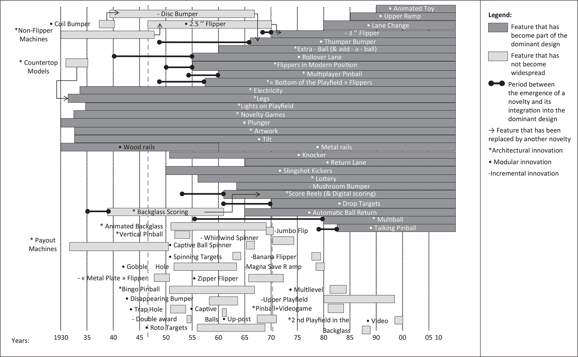 We also assessed the time lag between the emergence of a product innovation and its integration in the dominant design. Anderson and Tushman (1990) defined a dominant design “as a single configuration or a narrow range of configurations that accounted for over 50 percent of new products sales or new process installations and maintained a 50-percent market share for at least four years.” Because sales figures of the different models are not available, we considered that a specific feature incorporates (or not) the dominant design if we could track it (or not) on 50% of the models designed or when the three main manufacturers integrated the feature (Bally, Gottlieb, and Williams). In Figure 3, we represent those features that have become part of the dominant design and those that have not become widespread. We also highlight changes in the dominant design by indicating the features that were replaced by others as well as the length of time before a new characteristic became integrated into the dominant design.