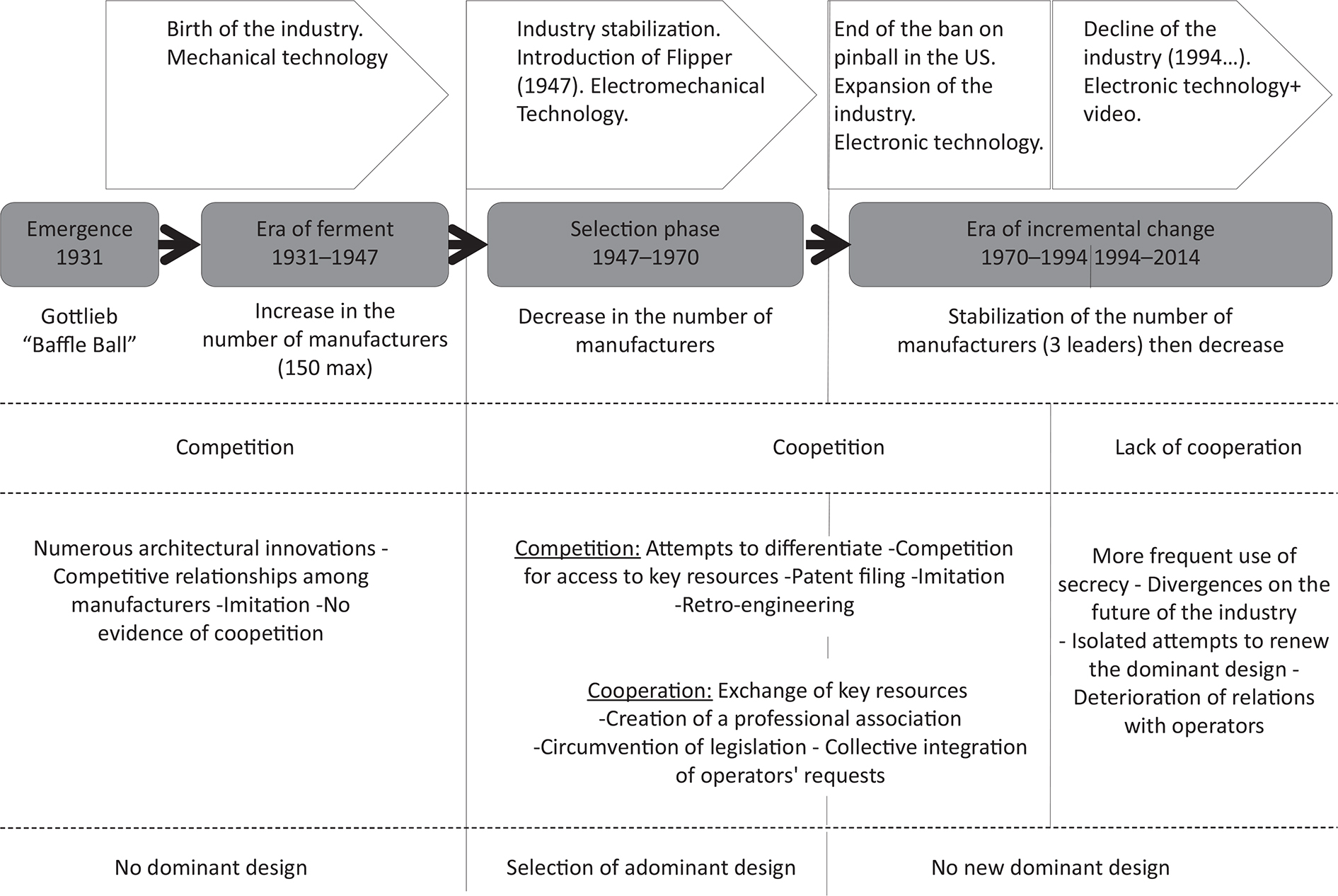 Most studies concerning dominant designs focus on ‘collective’ or ‘competitive’ strategies that companies deploy to impose their choices on the market. The objective of this research is to assess the extent to which ‘coopetitive’ strategies may lead to a dominant design. We analyzed the development of a dominant design over an 84-year period through a historical study in the field of pinball machines. Our study focuses on the five main manufacturers of pinball machines and analyzes data from 1930 to 2014. We demonstrate that companies undergo three phases that involve the progressive development of coopetitive relationships with different impacts on the generation of innovation. Because manufacturers differentiated their offerings, innovated and simultaneously imitated others, increased competition resulted. Simultaneously, external threats and the need to collectively respond to clients and partners prompted the manufacturers to cooperate with one another. Thus, our research provides a better understanding of how specific horizontal coopetitive relationships among manufacturers of the same type of products impact the development of a dominant design at the industry level. This case study suggests that as a theoretical framework, coopetition introduces new insights into the comprehension of relational dynamics during the development of dominant designs. Our observations also confirm or invalidate conclusions drawn in previous works related to coopetition strategies. In particular, this case is interesting as although the appropriability regime was weak, companies still developed coopetitive relationships, contradicting previous studies.