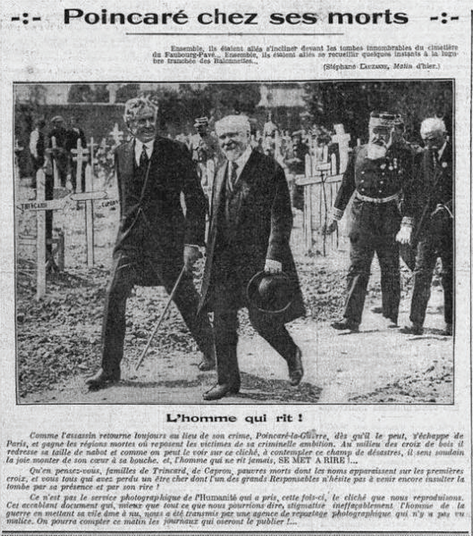 Changing the meaning of a picture with a single detail is a basic technique of propaganda and manipulation. In 1917, President Raymond Poincaré was vilified as ‘The man who laughs in graveyards’ (Figure 8). During a ceremony in a cemetery, Poincaré was photographed with a strange facial expression, probably due to too much sunlight. Published in L’Humanité with the caption ‘The laughing man’, the photo caused a scandal.