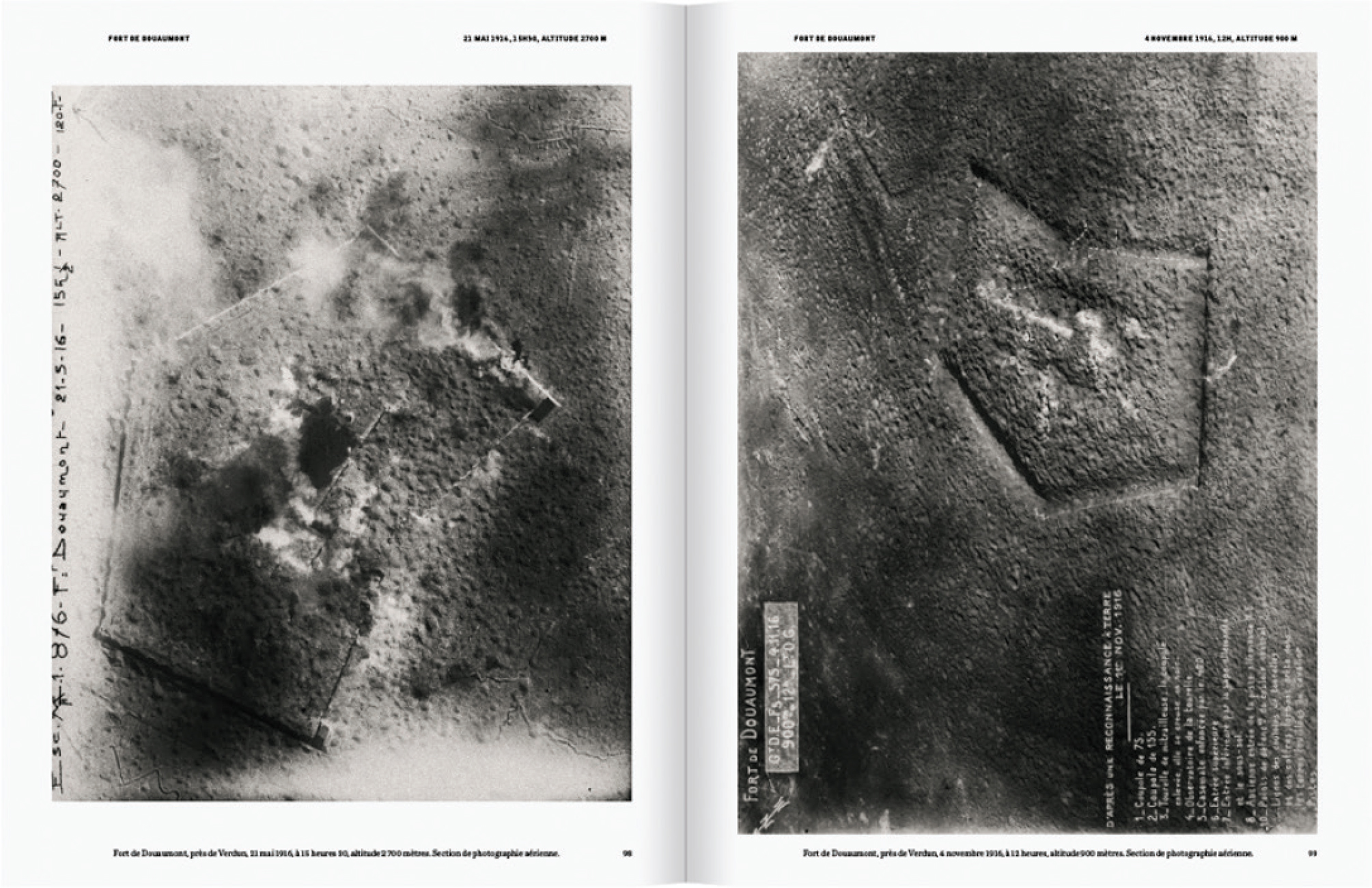 Observation is one of the methods used in the military to collect information about the enemy, especially at war. When photography became reliable enough and cameras relatively easy to operate, the armed forces adopted the medium. During World War I, they sent photographers up in air balloons and, later, in planes, to collect intelligence on a variety of topics: how many troops, guns, tanks, and planes?; where were they?; how were they protected? the states of roads, bridges, and railways; etc. Damage assessment was also a key concern: if you bombed trenches, for instance, you wanted to know if you hit the targets and how badly you hit them. On the prints, though, people like you and me would see little more than various shades of grey (Figure 10). No troops, no guns, etc., and even less damage to things you cannot see in the first place. It took specially trained experts to decipher significant information amidst this sea of grey (Petiteau, 2015).