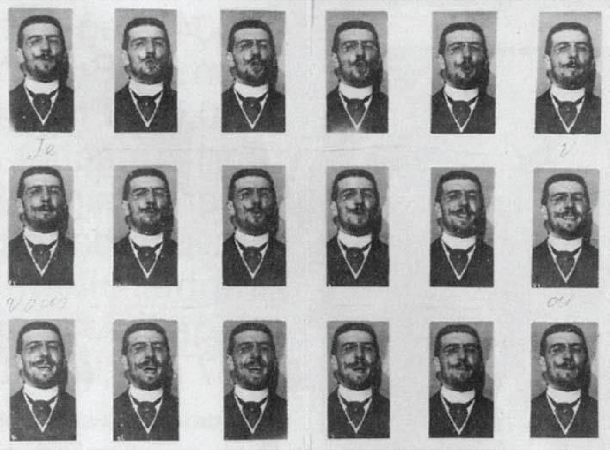 Educating the eye is demanding and sometimes means overcoming unpleasant emotions. In 1882, Etienne-Jules Marey, equipped with a ‘photographic gun’ of his own invention, photographed an ordinary man saying ‘Je vous aime’ (‘I love you’). At that time, no one had seen a human face talking and frozen into a picture. Usually, when being photographed, people were instructed to stop talking and stay still. Marey’s 20 photographs are strange, ugly, unpleasant pictures of a deformed face (Geimer, 2018) (Figure 12). The spectator has to accept the fact that it takes a monstrous face to say ‘I love you.’ Seemingly, inhuman acts produce the most human act.
