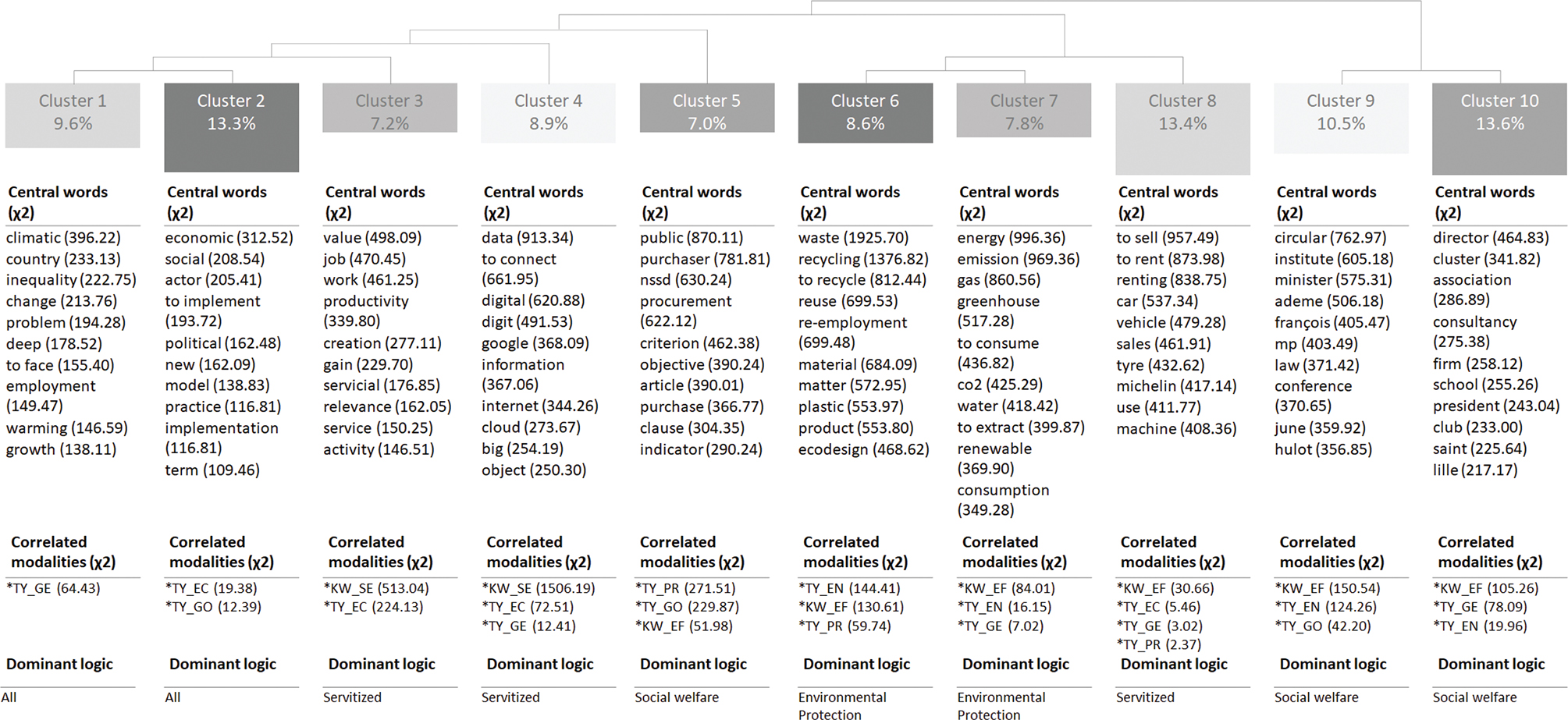 In the discourse on servitization, the environmental protection logic is essentially represented by Cluster 6, which covered 8.6% of the text segments in the descending hierarchical classification, and by Cluster 7, which comprised 7.8%. In Cluster 9 (10.5%), patterns of words prompting the environmental protection logic were intertwined with ones signaling the welfare logic.