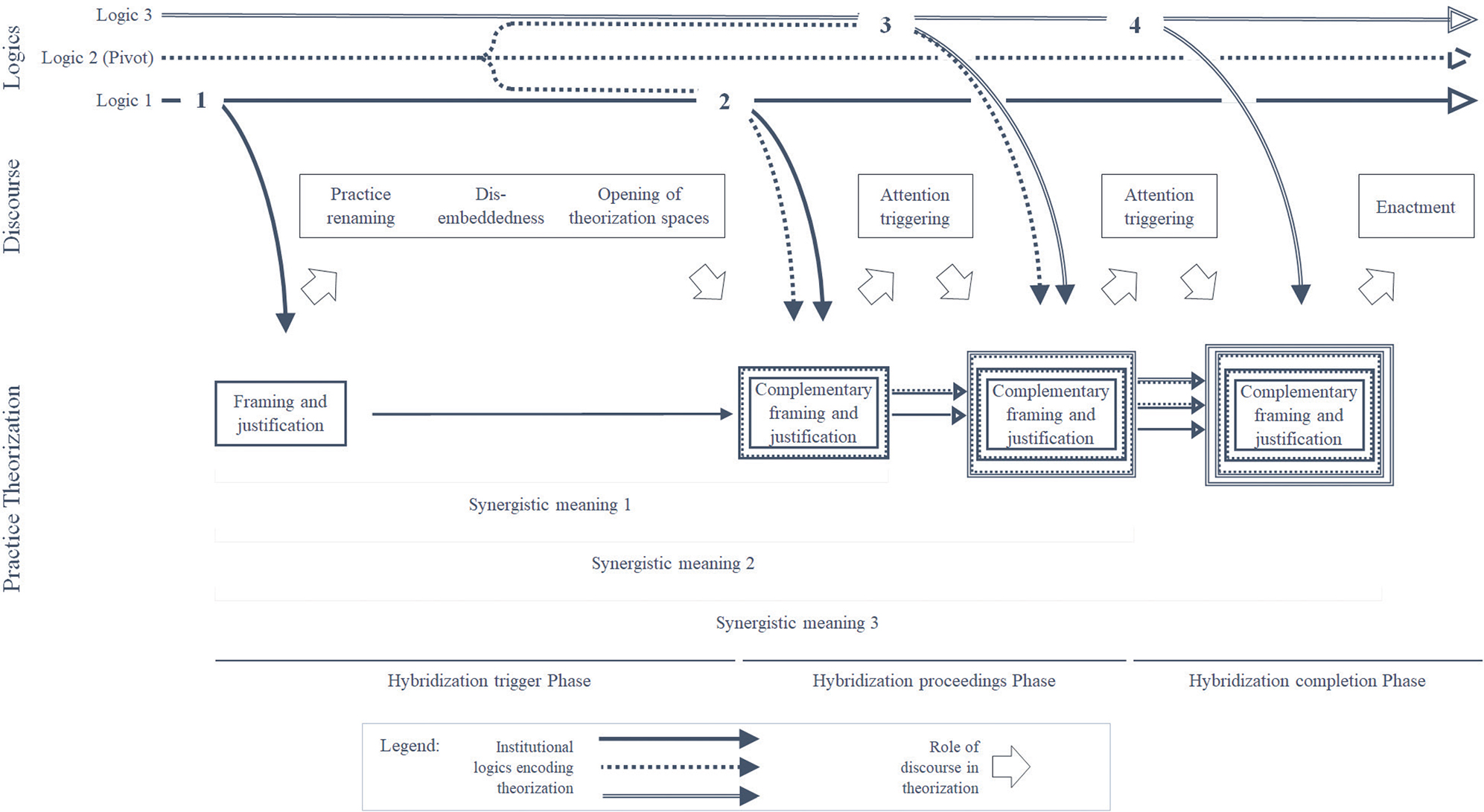 Based on these findings, I present a model describing how institutional logics, discourse, and theorization interact with each other to spawn a hybrid practice within an organizational field. This model is built on two mechanisms empowered by discourses: the renaming of the practice and the pivotal role of an institutional logic. This research makes three major contributions to theory. First, it brings to the fore the hybridization mechanisms that intervene at the organizational field level, in addition to those already revealed by the literature on hybrid organizing. Second, it presents the specific properties of words and vocabulary supporting the hybridization of practice, whether at the organizational or the organizational field level. Third, it identifies and characterizes the role of a pivotal institutional logic enabled by discourses in the hybridization of practice. These contributions are valuable in easing the tensions encountered by organizations engaged in hybrid practices. They also lead to hybrid practices incorporating more than two institutional logics and, in so doing, offer a way to reconcile business goals with environmental protection and social welfare goals. This work also has managerial implications in that it uncovers the meaning of servitization in France. Furthermore, it suggests that the transition to more sustainable organizational practices involves the reframing of existing practices rather than the invention of new practices.