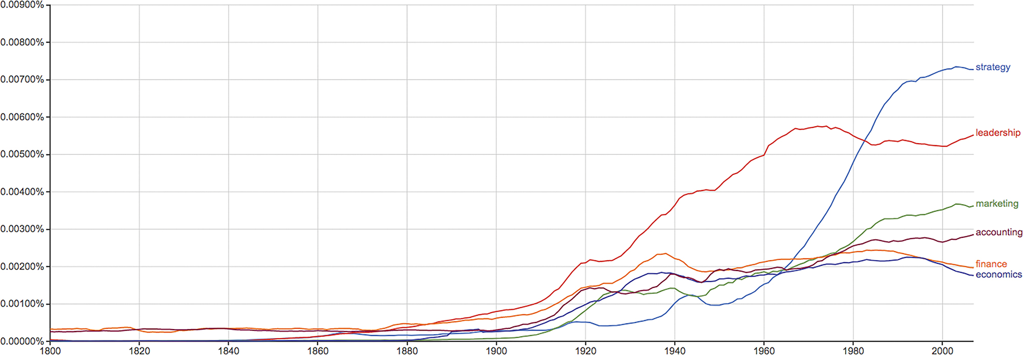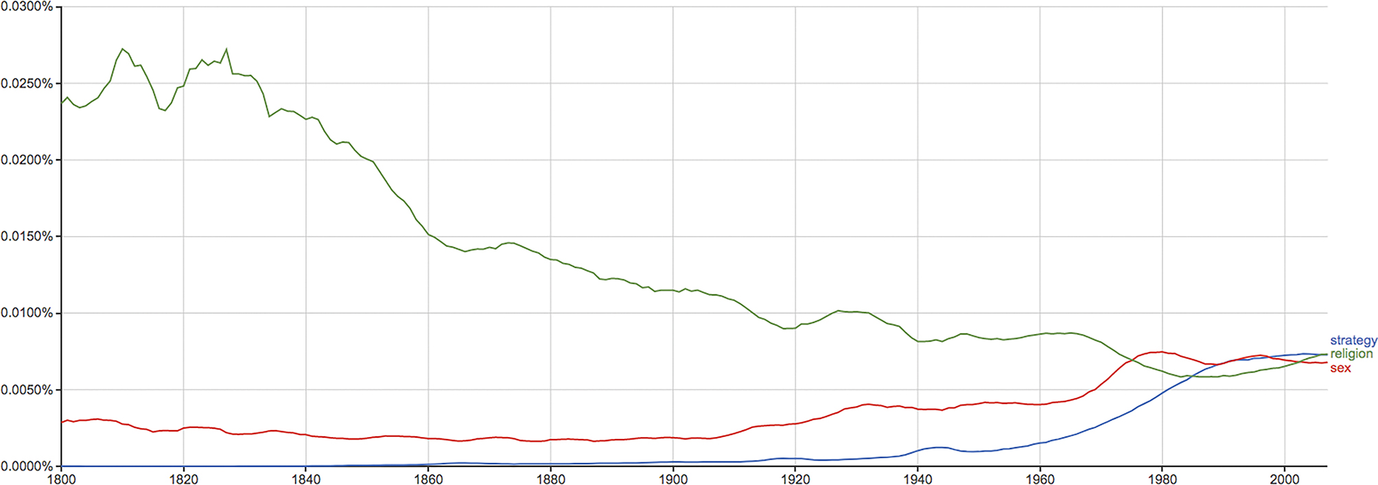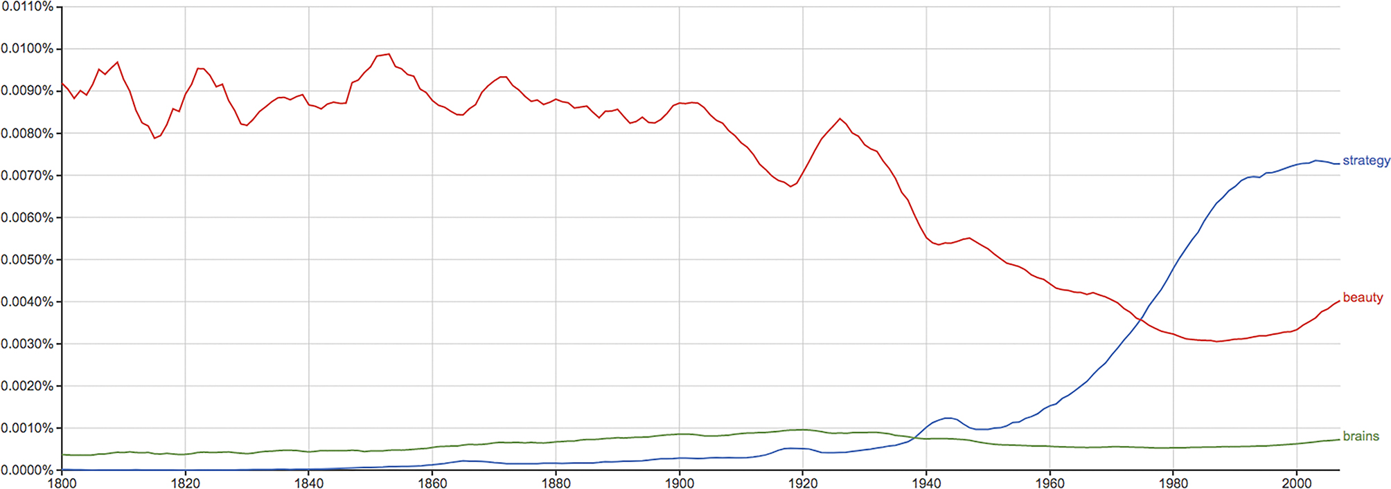 To test our hypotheses, we combine traditional analytical techniques, such as counting and making diagrams, with cutting-edge analysis of really Big Data. More specifically, we use Google Ngram Viewer to search all books published in English from 1800 to 2007 for selected words. The idea here is that the market for words is highly efficient (Coase, 1974), which implies that the number of times a word appears in the corpus a given year is a perfect measure of its importance.
