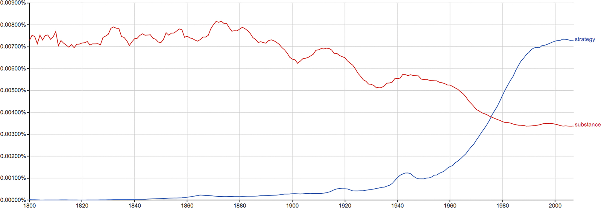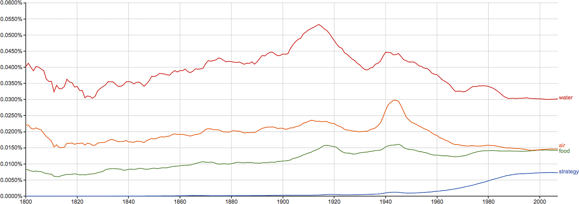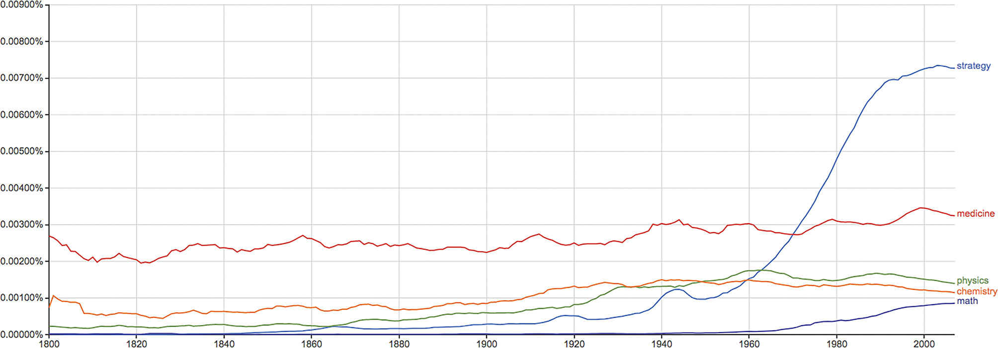 To test our hypotheses, we combine traditional analytical techniques, such as counting and making diagrams, with cutting-edge analysis of really Big Data. More specifically, we use Google Ngram Viewer to search all books published in English from 1800 to 2007 for selected words. The idea here is that the market for words is highly efficient (Coase, 1974), which implies that the number of times a word appears in the corpus a given year is a perfect measure of its importance.